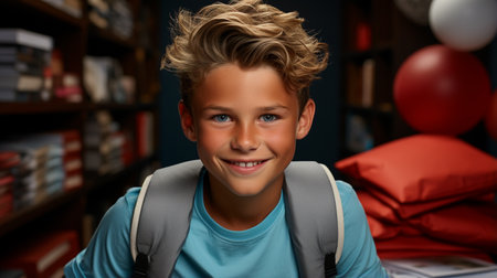 Close-up Portrait of a Happy Smart Young Boy, Smiling and Looking at Camera. Background Blurred Bookshelf.