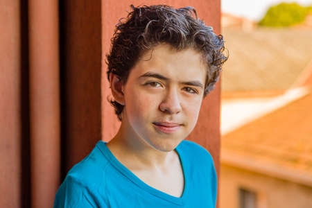 portrait of hispanic boy guy that inspires confidence in blue T-shirt