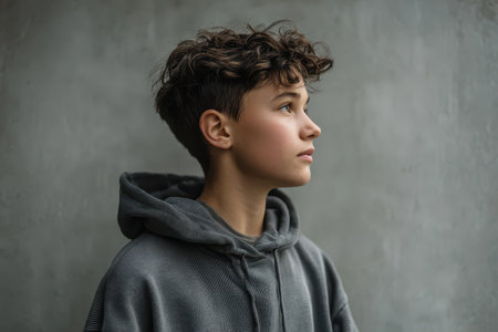 Young person in grey hoodie standing in side profile against a textured wall with a thoughtful expression during a calm afternoon