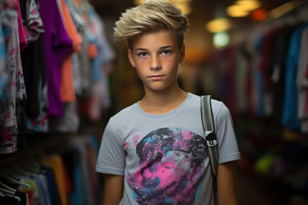A young man stands in a clothing store, wearing a shirt with a face on it. He is holding a backpack and looking at the camera. Concept of curiosity and exploration