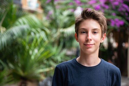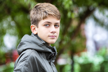 Stylish blond teen boy 14-16 year old over green nature background closeup. Looking at camera. Tenagerhood.