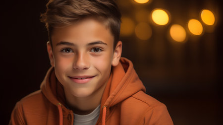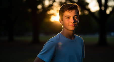 A teenage boy with relaxed smile is sitting at table, showcasing calm and friendly demeanor. background features blurred outdoor setting, enhancing warm atmosphere