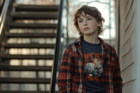 Pensive boy wearing a plaid shirt stands next to a staircase, gazing thoughtfully into the distance with a curious expression