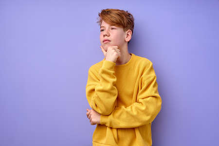 Let me think. Portrait of pensive clever redhead schooler in yellow shirt with puzzled serious expression, child thinking doubting, making choice. indoor studio shot isolated on purple background