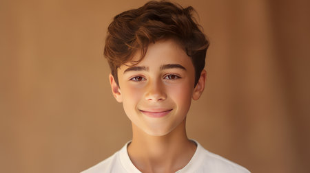 A young boy smiles for the camera while wearing a white t-shirt against a gray backdrop