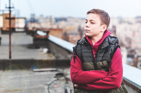 Studio portrait of a teenage boy with crossed arms on a chest.