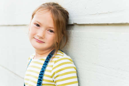 Outdoor portrait of cute little 8-9 year old girl with brown hair, wearing white jacket, standing against white background
