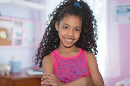 Portrait of girl with black curly hair, arms folded, looking at camera smiling