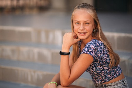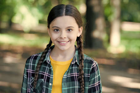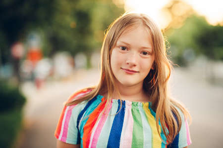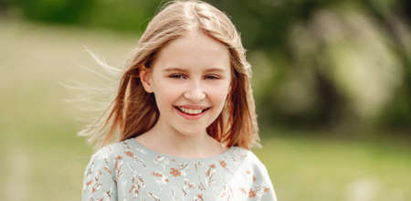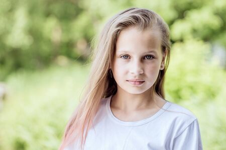 Portrait of adorable smiling little girl child preteen in the park outdoors closeup