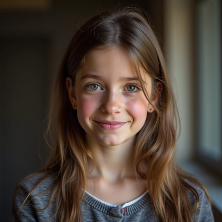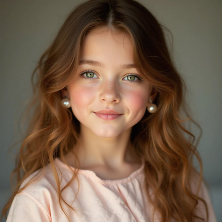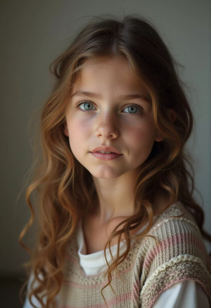 A young Caucasian girl with beautiful eyes and wavy hair stands smiling softly. Her playful demeanor shines through as she poses in a cozy indoor setting in France. Generative AI.