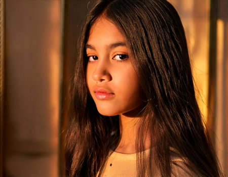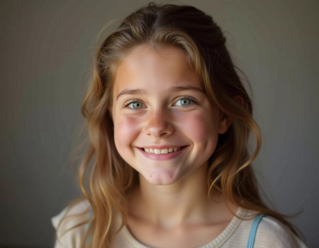 A cheerful girl around 10-15 years old with long hair and bright eyes, resident of USA, smiles at the camera. The setting features a plain backdrop, highlighting her joyful expression. Generative AI.