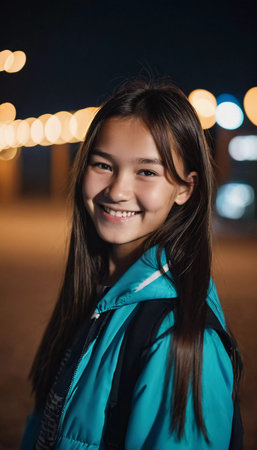 A delightful portrait of a young girl smiling brightly in an outdoor setting. Her joyful expression radiates happiness against a colorful background.