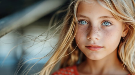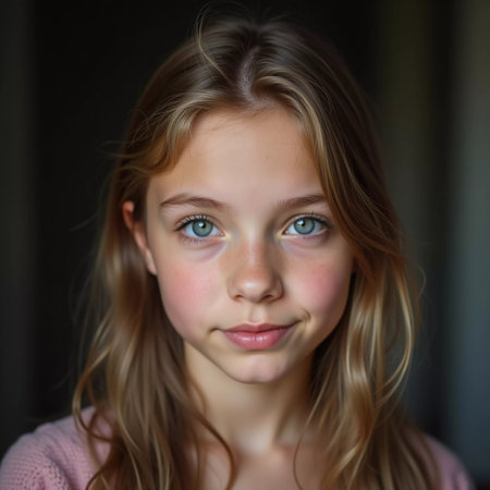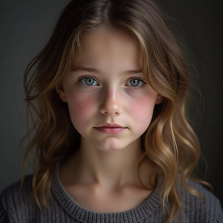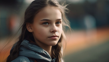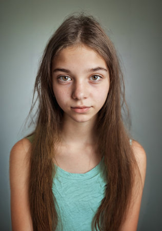 teenager or child, girl, age 8 to 14 years, caucasian light brown hair, white light skin tone, portrait face closeup, neutral facial expression, emotionless or thoughtful, young generation alpha
