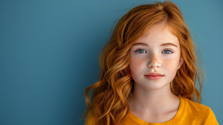 A young girl with beautiful curly red hair gazes softly at the viewer, showcasing her bright blue eyes and a warm smile while standing in front of a soothing blue wall. Copy space.