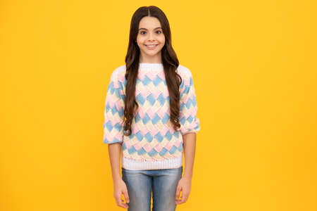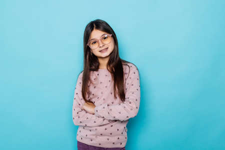 Studio shot of glad child. childhood happiness. Pleasant emotions. stylish teen girl turquoise background. pretty teen girl with long hair. kid fashion advertising. Back to school. copy space