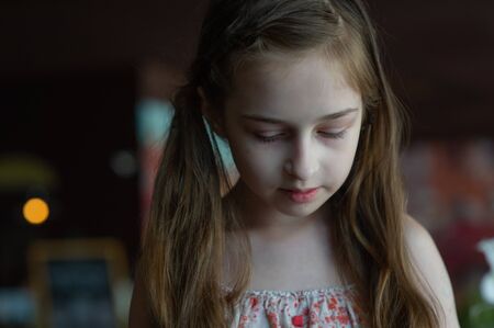 Portrait of a 9 years old female child, portrait concept of a child. Close-up face of beautiful girl 8-9 years old. Concept child teenager. A girl with long blond hair. Girl 9 years old in a cafe