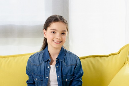 portrait of smiling preteen child looking at camera on sofa at home