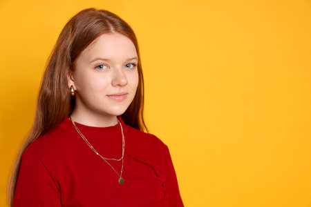Teenage girl wearing stylish jewellery on yellow background, space for text