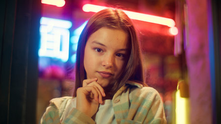 Puzzled Caucasian Asian junior kid contemplate in city schoolgirl brainstorm girl child think about problem teen teenage pensive evening neon. The inscription noodle in Chinese. Translation: noodle.