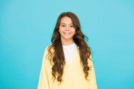 Kid girl long healthy shiny hair wear casual clothes. Little girl excited happy face. Kid happy cute face feels excited blue background. Sincere excitement. Exciting moments. Excitement emotion.