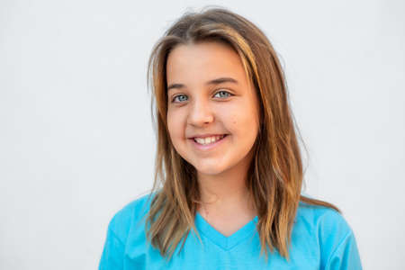 Cute preteen girl head shot. Child portrait on isolated background. Beautiful teenager face.