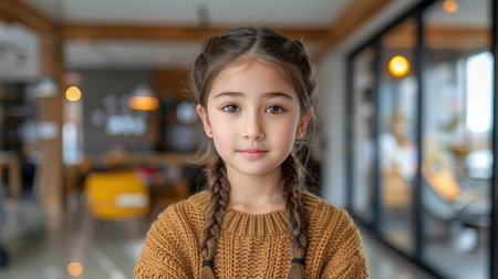 A girl with braided hair stands calm and poised in a stylish cafe setting.