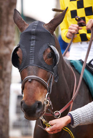 Head shot closeup portrait of a young racehorse under saddle during morning training