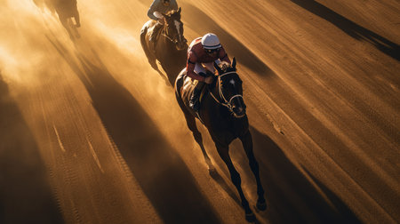 A captivating scene of a horse race showcases the intense competition between jockeys on fast-moving horses, highlighting the thrill and energy of the sport.