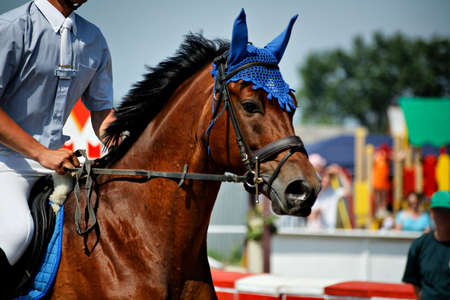 A racehorse with a jockey at the racetrack. Horse riding competitions.