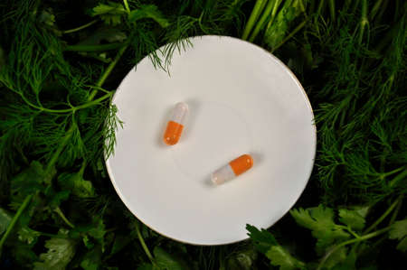Vitamin pills on a plate. Background of greenery. Healthy eating.