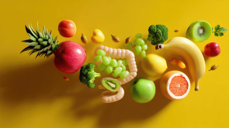 A vibrant display of fresh fruits and vegetables arranged creatively on a bright yellow background, showcasing their colors and health benefits.
