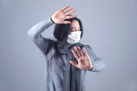 ill woman face mask hand stop sign on grey background