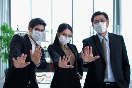 Business workers wear masks to protect and take care of their health.group asia business doing stop sing with palm of the hand