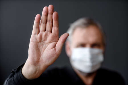 Young man wearing a medical protective mask against the Coronavirus Covid 19, showing stop hands gesture to stop the infectious virus outbreak. Concept of stop infection epidemic virus symptoms.