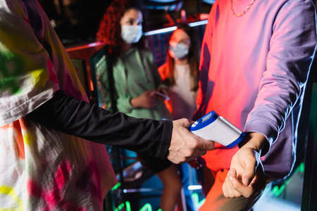 blurred interracial girls in medical masks near friend and controller with infrared thermometer