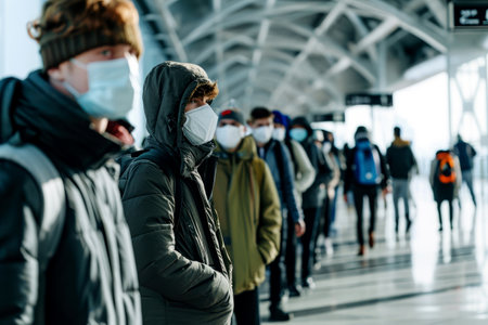 people Traveling line up apart at Airport with Face Mask - Generative AI.