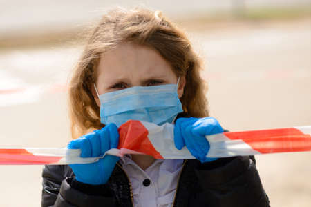 Portrait of sad caucasian child in face mask on closed playground outdoor. Social distance quarantine.
