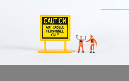 Miniature worker with Caution sign isolate on white background, construction industry concept