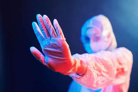 Epidemiologist gesturing Stop hand sign in quarantine, selective focus
