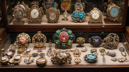 A stunning display of vintage jewelry and timepieces showcasing intricate designs and colorful gemstones in a glass cabinet, highlighting craftsmanship and elegance.