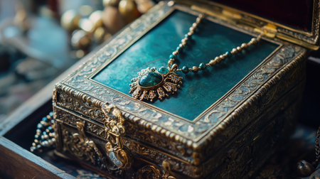 A captivating vintage jewelry box with intricate details houses a stunning necklace featuring a turquoise pendant, representing elegance and craftsmanship.