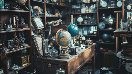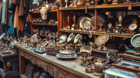 A variety of antique items displayed in a vintage store. The rich and detailed image showcases the charm and history of collectible treasures.