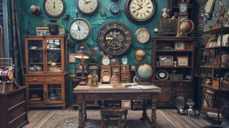 A vintage room filled with an antique clock collection, featuring various old clocks, a wooden desk, and globes, creating a nostalgic atmosphere.