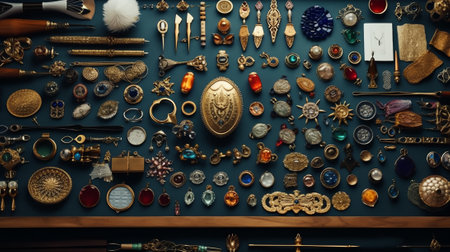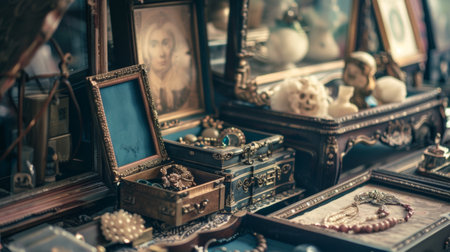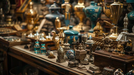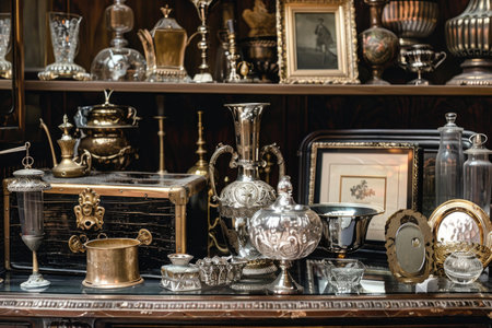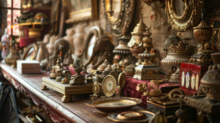 A collection of antique items displayed in a vintage shop, featuring ornate decorations and various collectibles. The rich details and nostalgic atmosphere evoke a sense of history and timelessness.