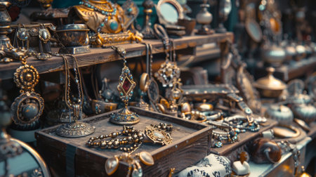 A rustic display of antique jewelry and collectibles on a weathered wooden table in a vintage shop, capturing a nostalgic and artistic ambiance.