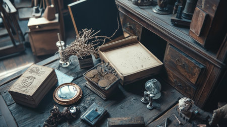 Steampunk decor on antique wooden table in dimly lit room with vintage ornaments.