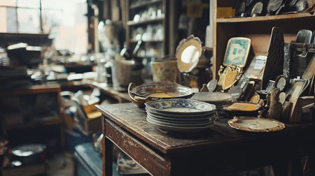 An inviting antique shop filled with vintage plates, mirrors, and rustic furniture, bathed in soft natural light. Perfect for retro, nostalgia, and interior decor themes.