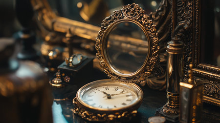 A luxurious composition of an antique clock and mirror with ornate gold detailing, set against a richly decorated background.