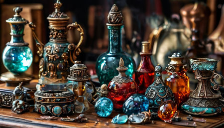 Ornate antique bottles and gems on a wooden table, rich detail in decor