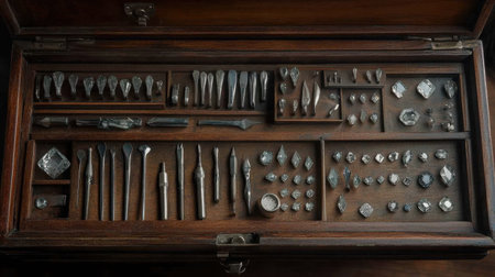 Explore a vintage wooden box filled with a diverse collection of precision tools, ideal for craftsmanship and artistic endeavors in a creative workspace.